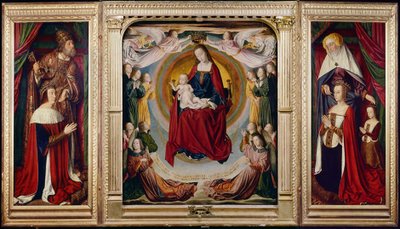 Also in the cathedral is a beautiful triptych of around 1500 by the Master of Moulins. The central panel shows the Virgin in Glory, with the moon under her feet, symbolic of the Immaculate Conception. The side panels show the donors, Peter II, Duke of Bourbon, and his wife Anne of France, with their daughter Suzanne, kneeling beside their patron saints, Peter and Anne. Sources include: