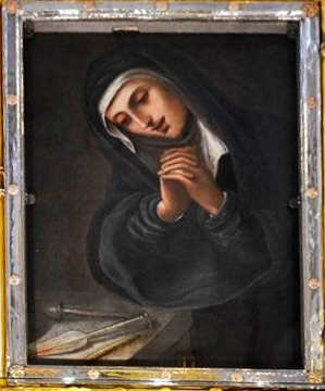 The sacred picture – attributed to local artist Narciso Guidone, active in the early 1600s – is mounted in an elaborate frame, on the back of which is another painting depicting the Veil of Veronica – a cloth bearing the face of Christ crowned with thorns, recalling the legend that when St. Veronica wiped Jesus' face on his way to Calvary, his true image (vera icona) became imprinted on the fabric. Trapani's Holy Week ceremonies begin with the procession of the Pietà dei Massari on Tuesday evening. The teamsters carry the towering work through the streets, arriving finally at a temporary chapel they've built in Piazza Lucatelli, where the image of the Sorrowful Mother waits under guard through the night.[1] On Wednesday the fruit sellers of Trapani carry the image of their patron, the People's Pietà (right), surrounded by flowers and candles, from the Church of the Holy Souls of Purgatory through the streets of Trapani. The route varies but always includes a stop at Piazza Lucatelli, where the two Madonnas meet and the groups exchange a candle, symbolic of the resolution of a quarrel in 1885. The Pietà del Popolo is similar to the Pietà dei Massari, showing the Virgin alone in darkness, gazing at a nail and spear that had pierced her son. Dated to the late 1600s and attributed to local artist Giovanni Battista de Vita, it too is mounted in a baroque frame with a painting of Veronica's Veil on the reverse. [2]
