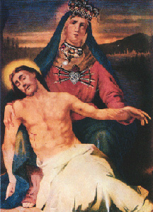 Beata Vergine Addolorata, Campocavallo, Osimo, Ancona, Marche, ItalyIn the 1870s, a small country chapel was built three miles from Osimo, a town just inland from the Adriatic near the world-famous shrine of Loreto. Don Giovanni Sorbellini, appointed in 1883 to say holy day masses at the Campocavallo chapel, hung in it an oleograph of the Pietà he had bought from a traveling salesman. On June 16, 1892, a few women who stayed to pray after mass saw the eyes of the Sorrowful Virgin move and blink. News of the "prodigy" traveled rapidly and widely. On July 7, a blind woman regained sight. The same year, Don Sorbellini began building the present magnificent sanctuary, consecrated in 1905. It's the focus of the Festa del Covo, a Nativity-themed harvest festival the first Sunday of August, and the Festa dell'Addolorata the third Sunday of September. (Information from Osimo's website, www.comune.osimo.an.it; image from Basilica-Santuario di s. Giuseppe da Copertino, www.sgiusecoperosimo.it.) |