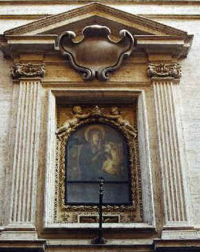 Madonna di Sant'Agnese, Rome, ItalyUnder the Pamphilij Pope Innocent X, the Doria Pamphilj princes rebuilt their Roman palace and associated church of St. Agnes in the Arena, the back of which now became the front, facing Bernini's new Fountain of the Four Rivers in Piazza Navona -- site of the ancient arena where St. Agnes was tortured. A highly venerated fresco of the Madonna and Child, attributed to Antoniazzo Romano (active 1461-1508), was carefully removed from the old façade in 1652. On June 28, 1653, it was reinstalled on the new façade in a majestic niche designed by architect Carlo Rainaldi.Photo by Maria Cristina Giammetta from www.collezione-online.it. |