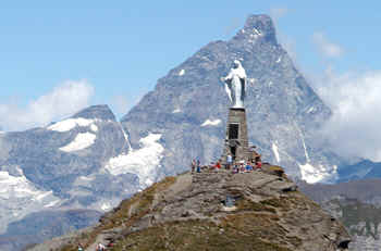 Madonna dello Zerbion, Saint-Vincent, Aosta, ItalyA monumental statue of the Madonna tops the summit of Mount Zerbion in the Italian Alps. At her foot is an inscription from the Piedmontese poet Giovanni Calchera (1907-1994): A Madonna who sows silver / opens her arms as in prayer / to protect the Valley and its people / in an eternal invocation of peace. The anniversary of the Madonna dello Zerbion is celebrated every year on July 29. The faithful set out the previous afternoon for an overnight waystation. In the morning they resume the climb, to arrive by 10 am for holy mass. The return is rewarded with a lunch of polenta, cooked in the open in antique pots. Sources: