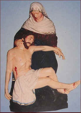 Panna Mária, Pozba, Nové Zámky, Nitra, SlovakiaIn 1512, Pauline Fathers built a Marian shrine, now a ruin in the southwest Slovakian town of Vel'ké Lovce but still a place of pilgrimage in the 1700s, when shepherds and pilgrims observed a white dove bathing in a spring in the woods five miles away, outside the village of Pozba. The story circulated that a shepherd's blind daughter regained her sight after washing her eyes with the dove's bathwater. The landowner made fun of this, wondering if the spring could help his blind horse. It did, but he went blind. A sick girl saw the Virgin, wearing a white dress and blue sash, in a pear tree, and was healed. From the wood of the tree a Pietŕ was carved, still venerated in a chapel by the spring, which hosts an annual pilgrimage on September 15, Feast of Our Lady of Sorrows.